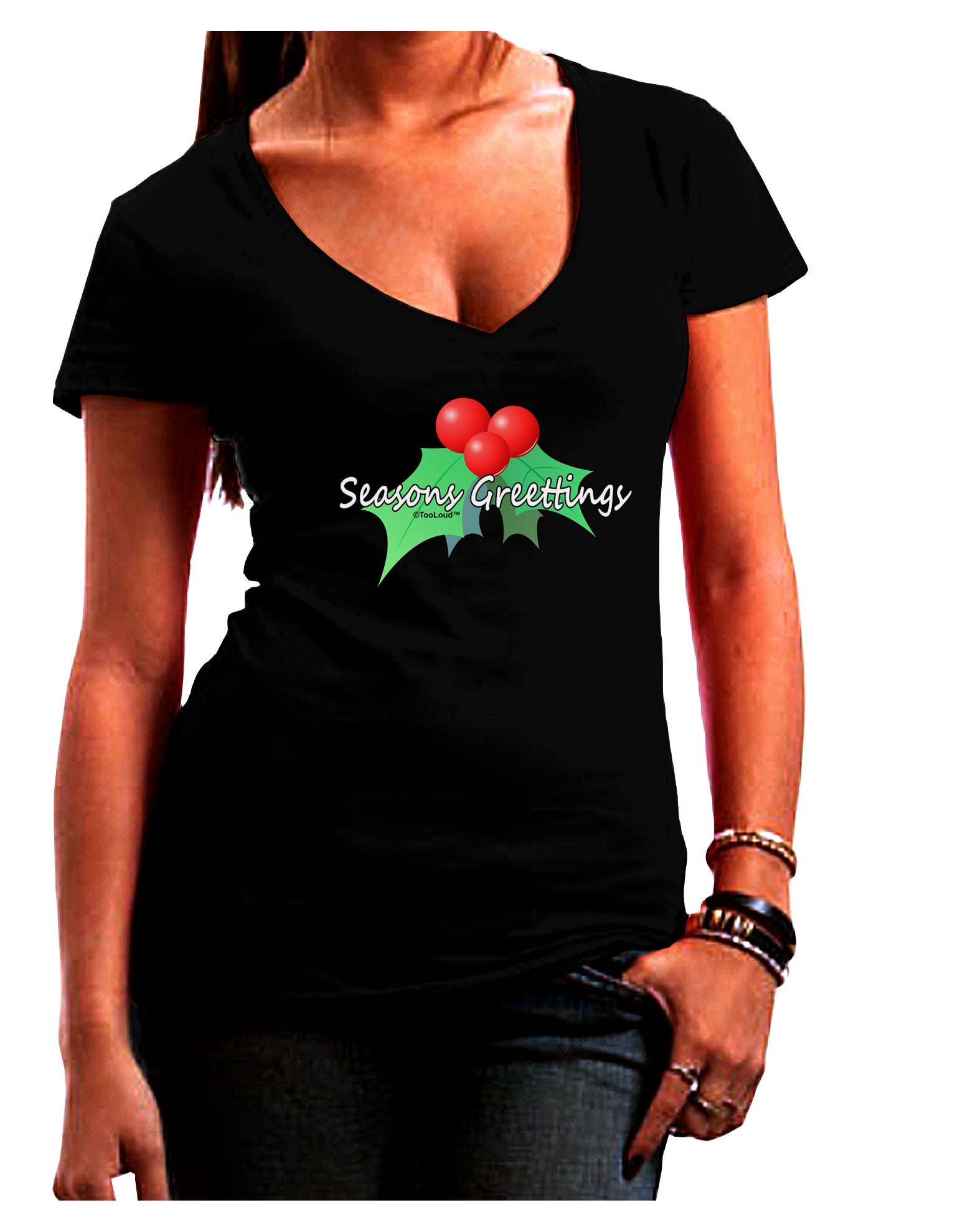 Holly Seasons Greetings Text Juniors V-Neck Dark T-Shirt by TooLoud