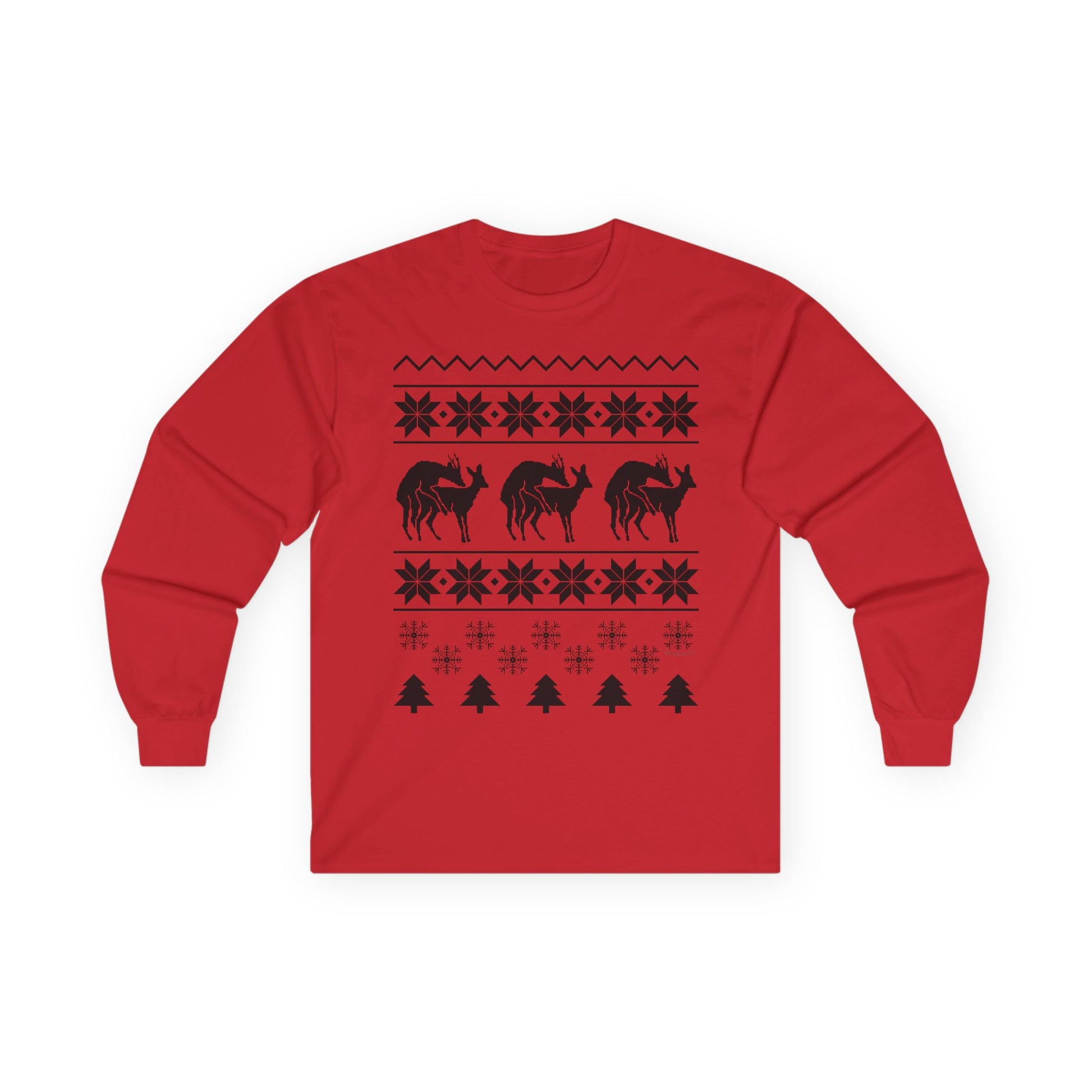 This hilarious design features a playful naughty reindeer pattern inspired by classic holiday sweater styles — perfect for parties, gag gifts, or anyone who loves to bring humor to Christmas celebrations. Made from soft, high-quality fabric, this long sleeve tee keeps you cozy and comfortable while spreading festive cheer (and laughs!).