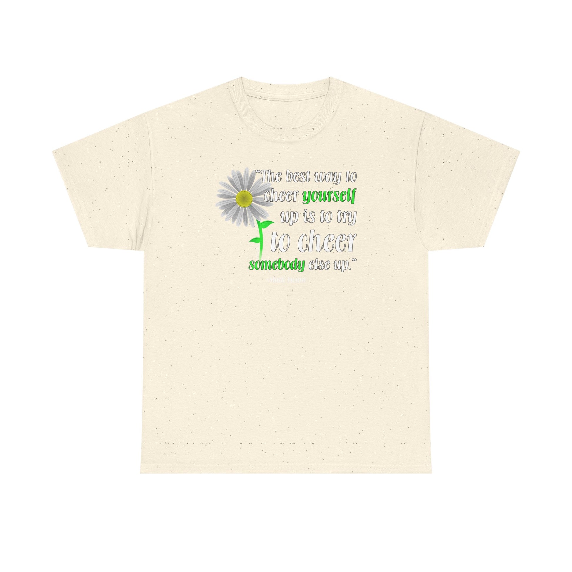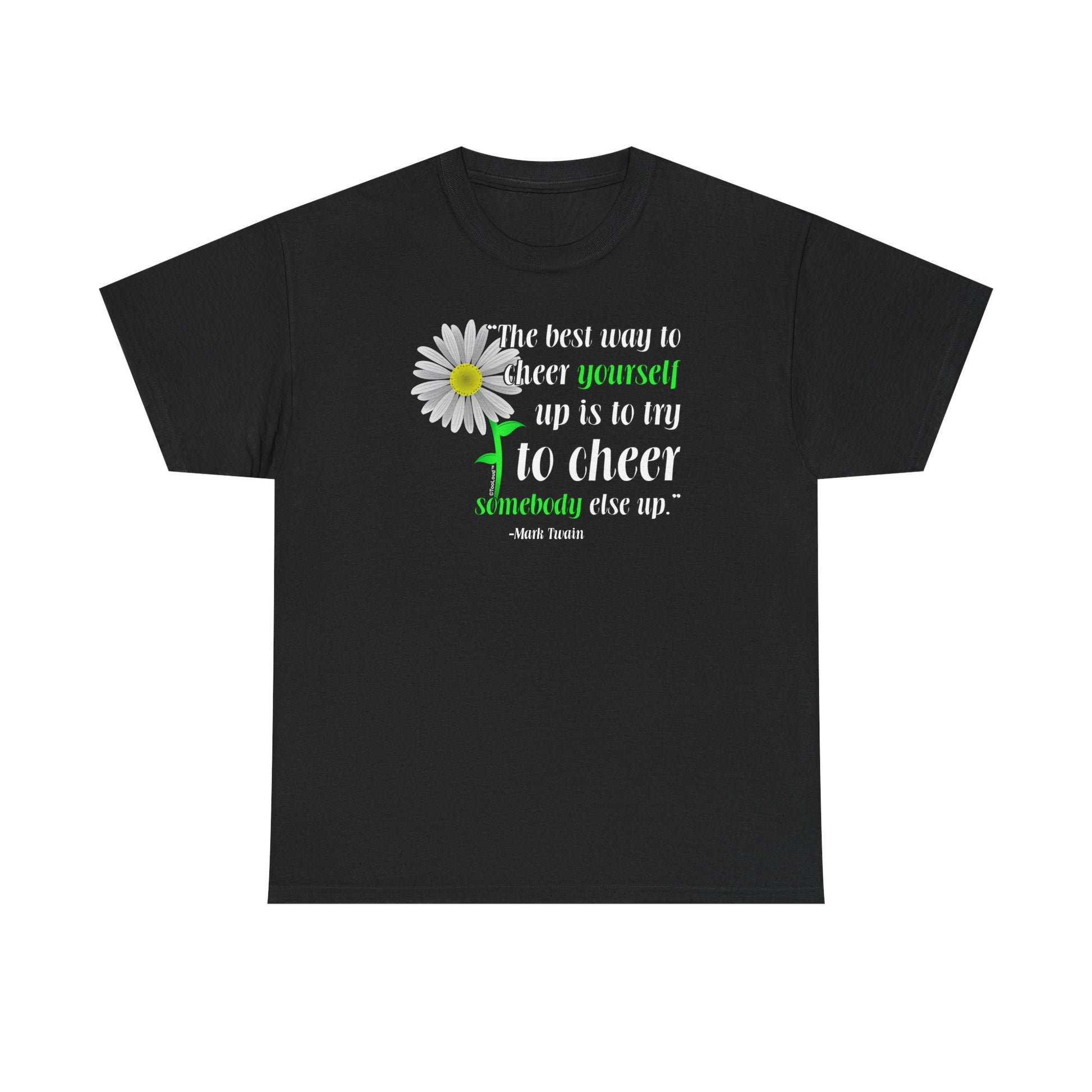 Promote friendship and kindness in the world with this inspiring quote by Mark Twain. "The best way to cheer yourself up is to cheer somebody else up" is motivational for those who are shy, or even having a bad day. This design would make a great gift for anyone! Spead positive vibes today! Available on many items. These fun printed garments are a great personal touch on you, or as a gift to a friend or loved one! Great for all-year-round too! Colors may differ from image, as each monitor is made and calibrated differently.