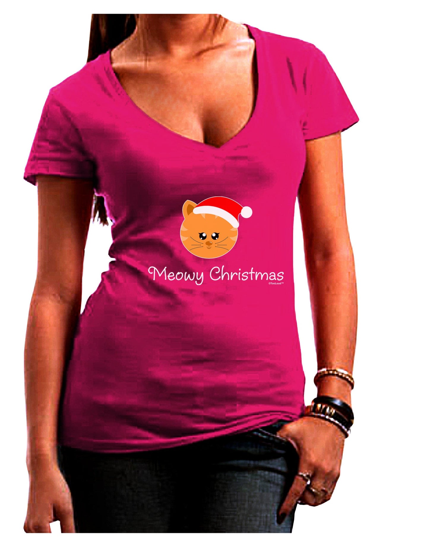 Meowy Christmas Cute Cat Santa Hat Juniors V-Neck Dark T-Shirt